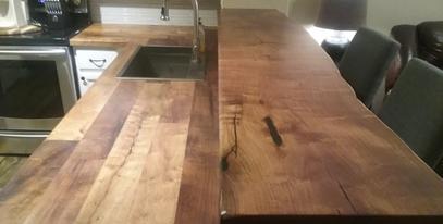 All of our counter tops have a natural oil/wax finish. This is a very durable finish that won’t leave rings from sweating cans, is water resistant, easy to maintain and will clean up with a damp rag while maintaining a rich, natural glow.